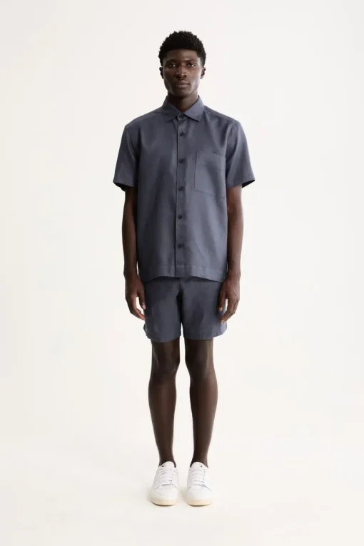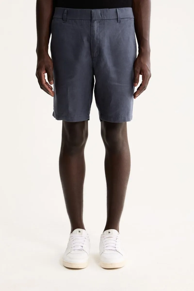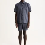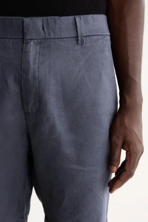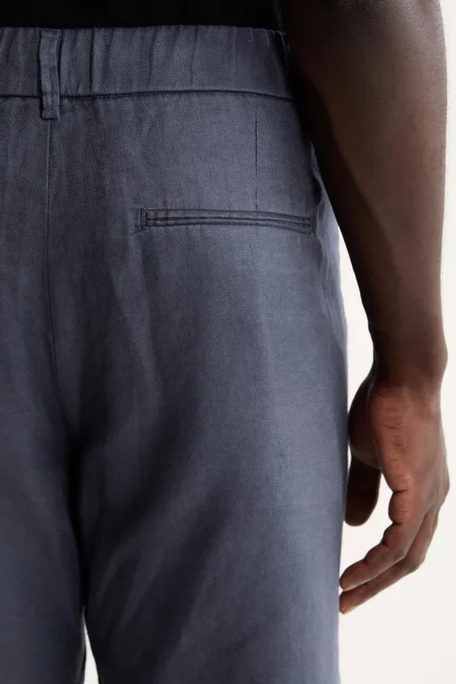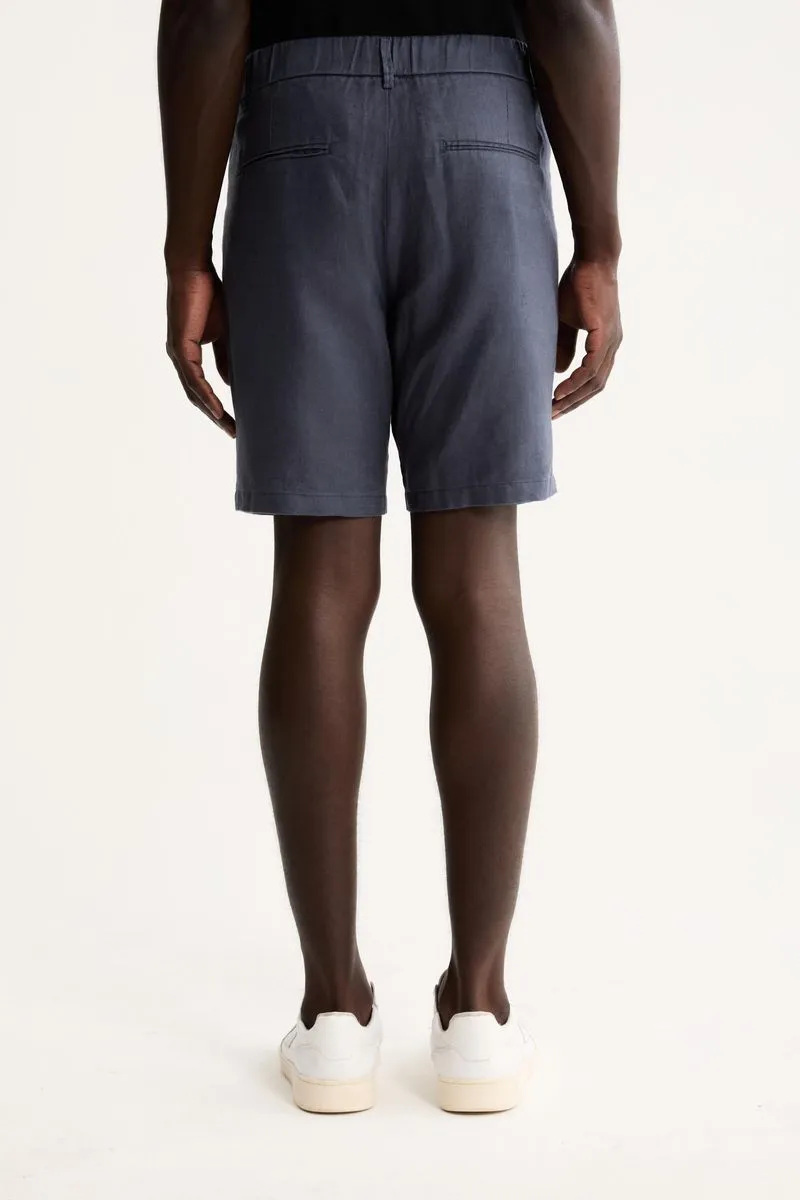 A bermuda é confeccionada em sarja 100% Linho, um tecido nobre que proporciona alta respirabilidade e um toque suave. O grande diferencial é o acabamento calandrado, um processo que confere um brilho sutil à peça, elevando seu visual e durabilidade.